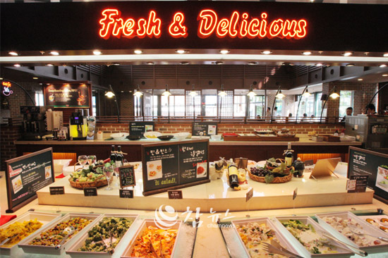 신선한 로메인, 양상추, 방울토마토, 옥수수, 치즈 등 20가지 이상의 토핑과 5가지 이상의 드레싱을 자유롭게 조합할 수 있습니다. 따뜻한 크림 스프, 토마토 스프, 각종 파스타, 미니 피자, 감자튀김, 치킨 너겟 등도 준비되어 있습니다.