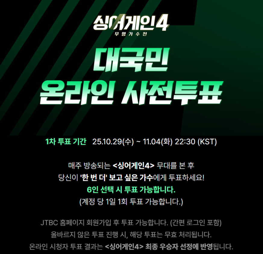싱어게임4 투표는 부정 행위를 엄격히 금지합니다. 매크로 프로그램이나 다중 계정 사용이 적발될 경우 투표가 무효 처리되고 향후 참여가 제한될 수 있습니다.